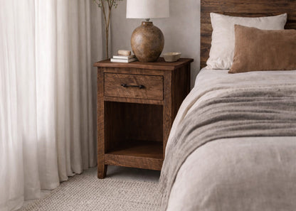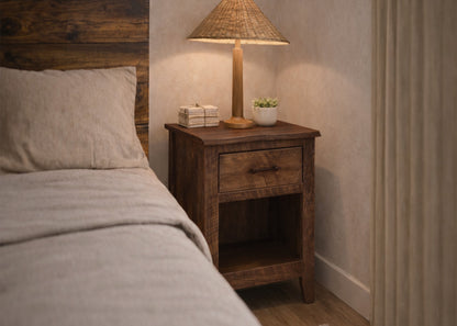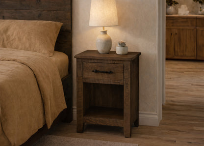 Beautiful rough sawn nightstand with a single drawer and open shelf with a live edge top.